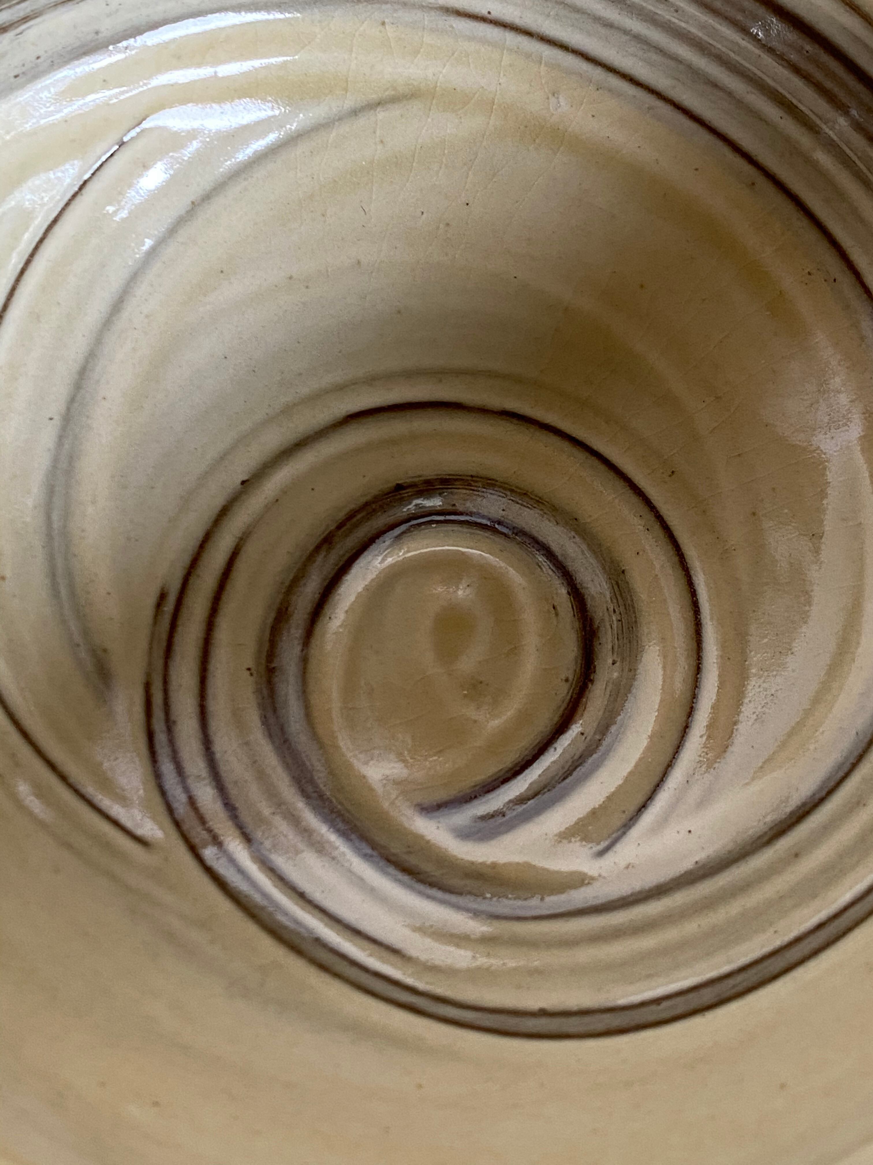内側に藁引きが施された丸みを帯びたフォルムが美しい縁が素焼きになっている丸鉢です。
