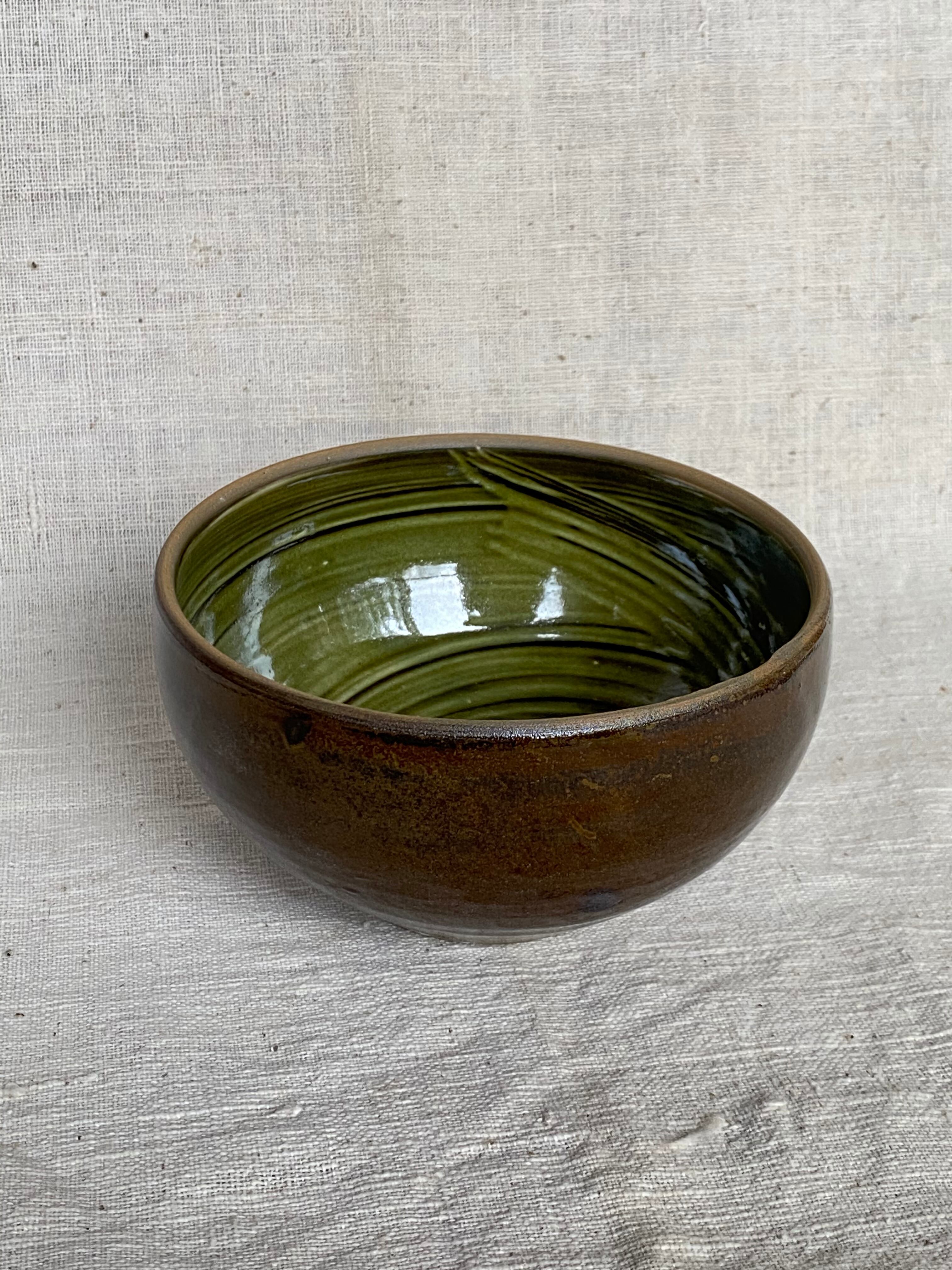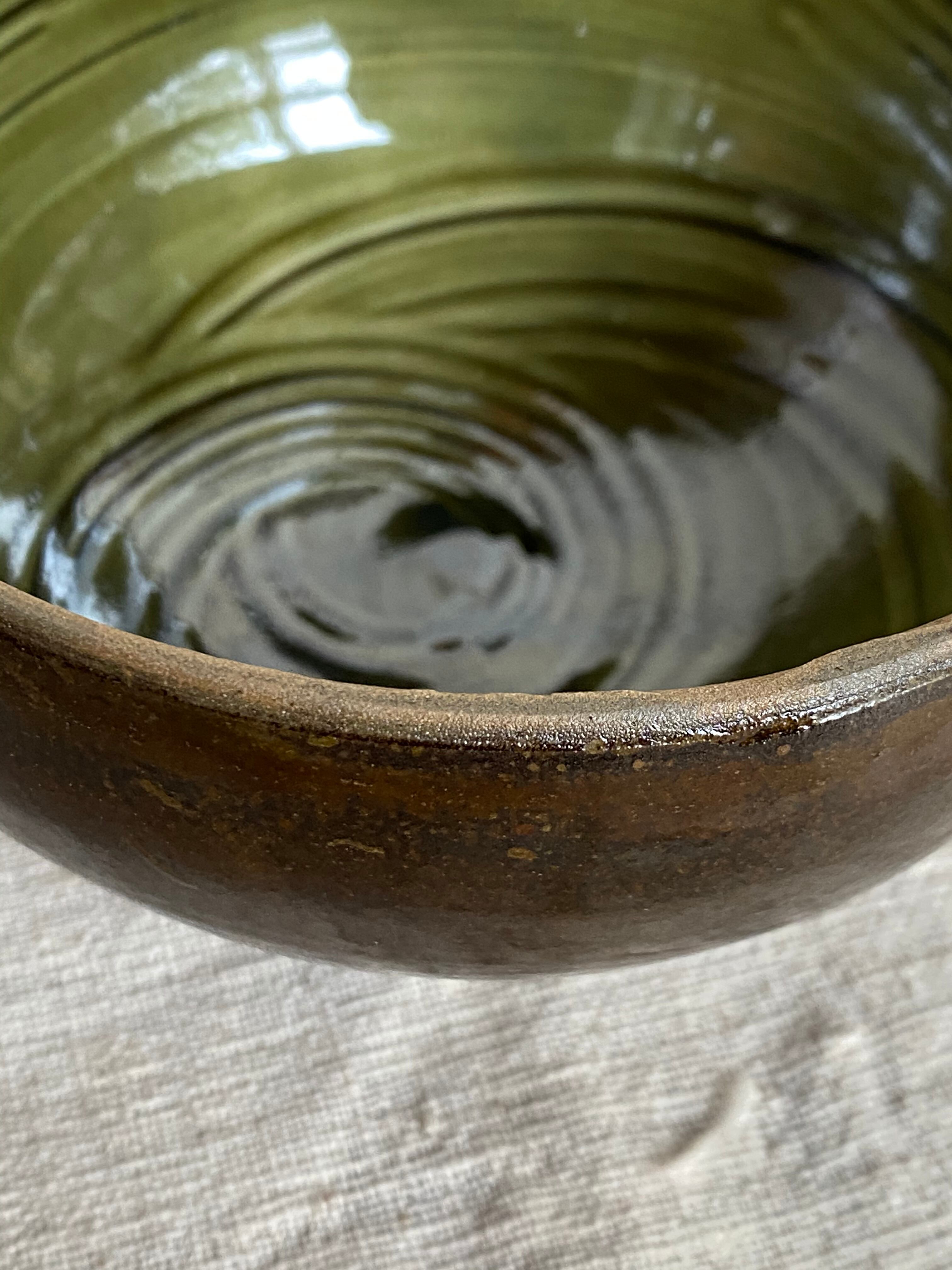 内側に藁引きが施された丸みを帯びたフォルムが美しい縁が素焼きになっている丸鉢です。