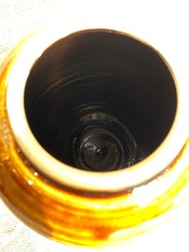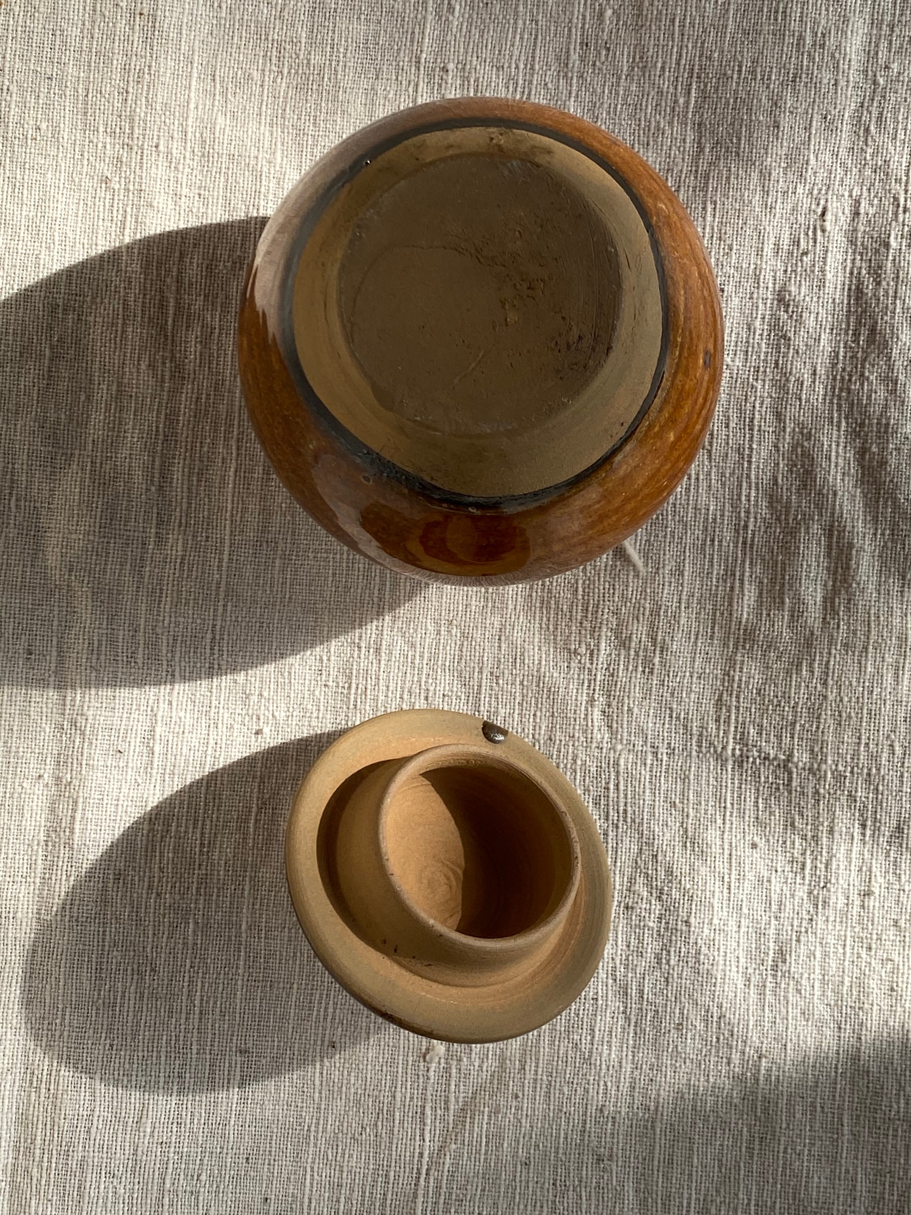 飴釉が施されたのみのシンプルで小ぶりな蓋付きの壷です。